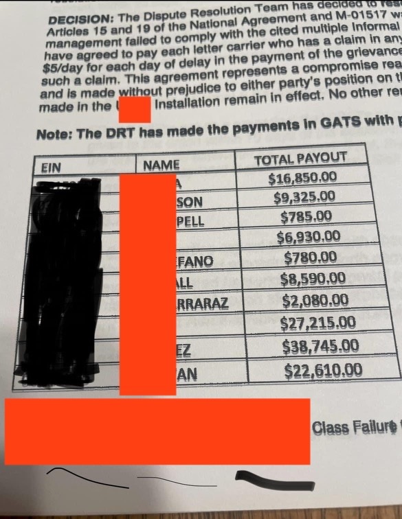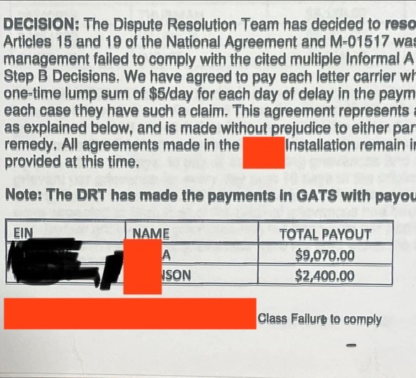 Someone sent me these. This is what can happen when carriers ask for the steward and/or notify the union of violations of the National Agreement and it is filed. I believe these are from California, but I could be wrong. Will it always be these amounts? No, but from the reports I always get of Article 8, 11, and 41 violations, carriers seem to be missing out on a lot of free money. I know I am. Only you can stop the abuse of you. Ask for steward time and file as you need to.