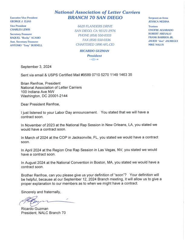 The letter below is known as speaking truth to power. You the dues paying members of the NALC are the ultimate people in charge of the NALC. I know some of those that hold office think they are your boss, but they aren’t. This September, October, and November of 2024 you should demonstrate the authority that you have.