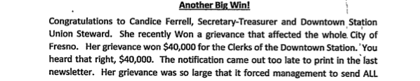This is the free money Fresno installation willingly gave to our brothers and sisters in the clerk craft. The clerks like free money, they ask for steward time, write statements, and are rewarded with a lot of free money. The clerks are expecting even more free money given to them by the Fresno installation in the upcoming months. Their union still has cases for free money pending out of Cedar, Clinter, and Hughes. Congrats to our brothers and sisters downtown, and may our sisters and brothers at Cedar, Clinter, and Hughes in the clerk craft get even more free money from the Fresno installation. When a union is unified, holds the management in the Fresno installation accountable for their abuse and violation of the National Agreement, and other transgressions free money follows.