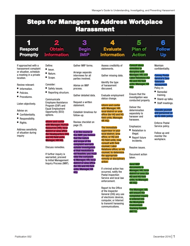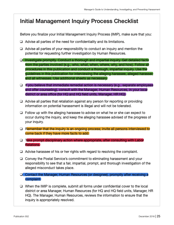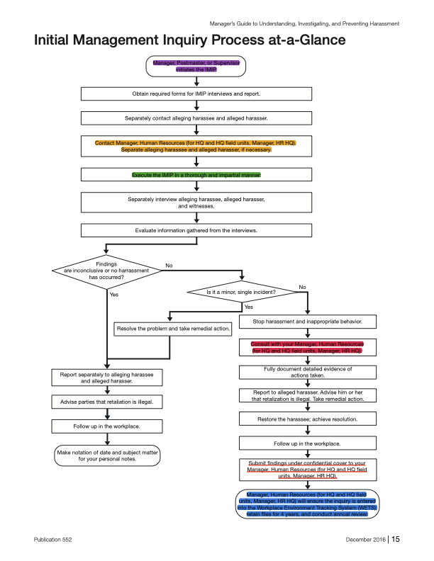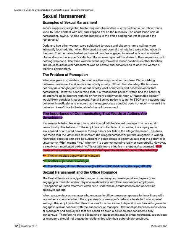 Below you will notice highlighted in blue, green, and yellow Publication 552 list who to report harassment to. Notice the blue shows you The Manager, Human Resources (for HQ and HQ field union, Manager, HR HQ). It seems, that in the new realignment going on, that several functions that use be controlled at a district level, were taken away, and now seemingly report directly to regional areas.