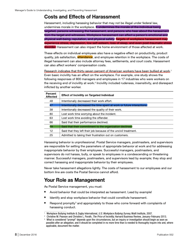 In Publication 552 USPS admits to the “Cost and Effects of Harassment”, please note highlighted in yellow is attendance. We always hear about poor attendance, so maybe management should look into the mirror. They are wondering what is causing the attendance issues here in Fresno.