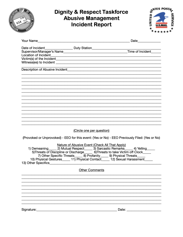I found both of these report forms below online at different NALC Branch websites. Print out whichever format that you like, and keep a stack in the drawer of the case, so you can grab one anytime a management type is abusive to you, a brother, or a sister at your station. These too will start being elevated to the proper people if you are ok with it. Give a copy to your elected official while giving them the PS Form 1767 too.