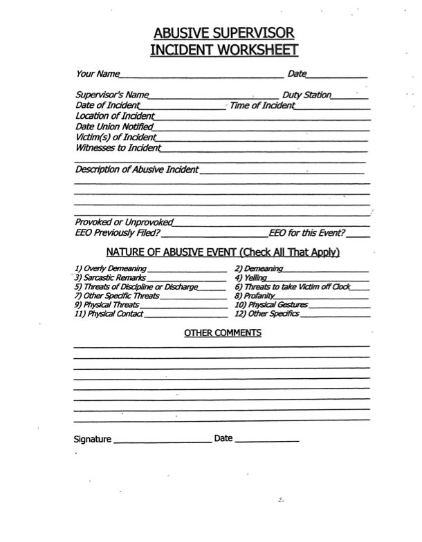 Print as many of the “Abusive Supervisor Incident Worksheet” below that you need, and complete them as needed. Give these to your steward, email/text to a Chair Officer, or drop them off at NALC Branch 231.